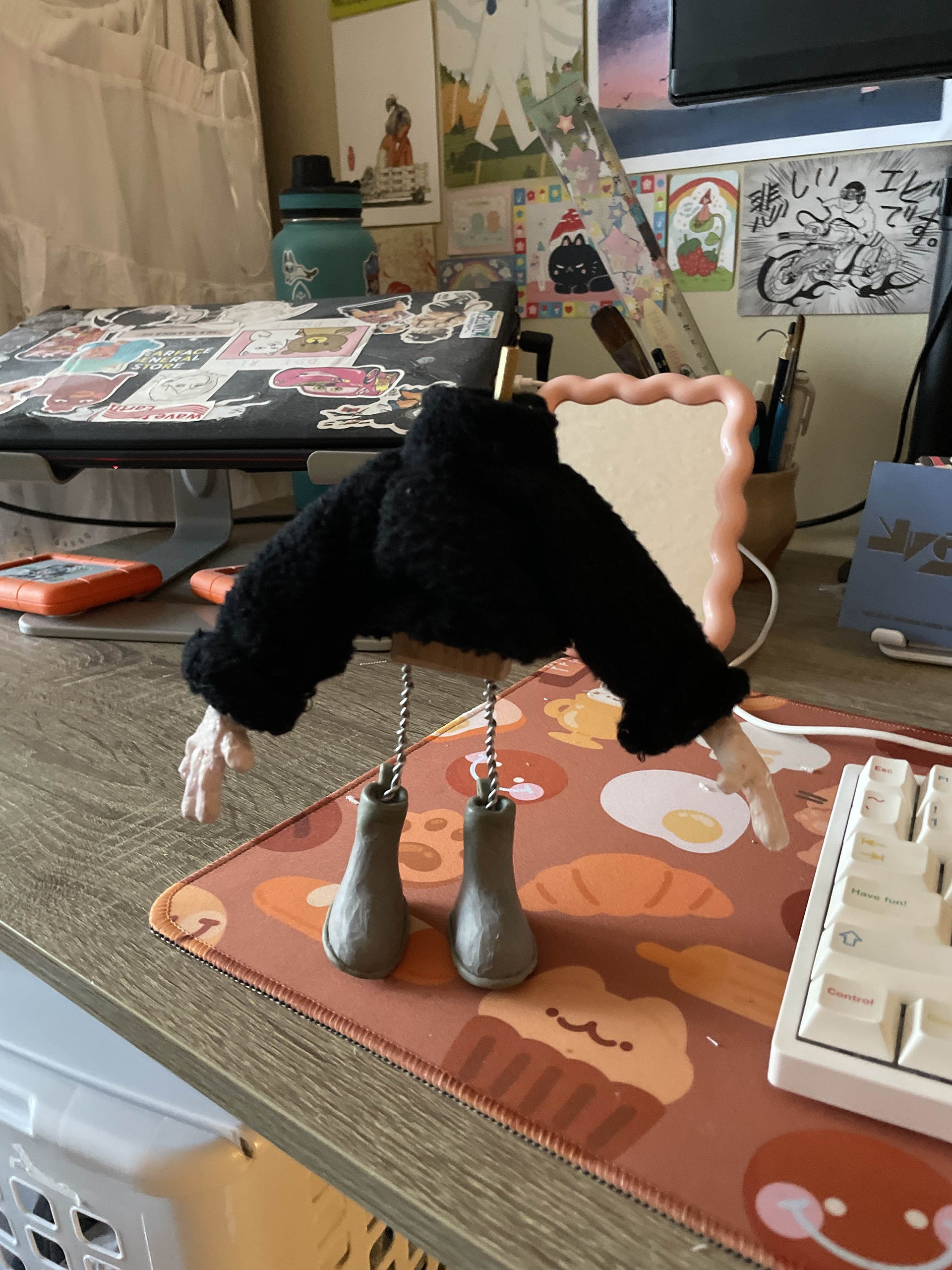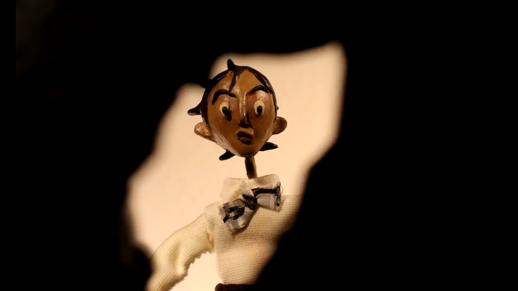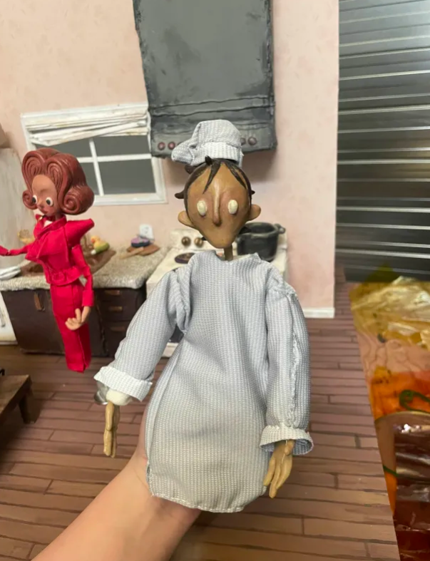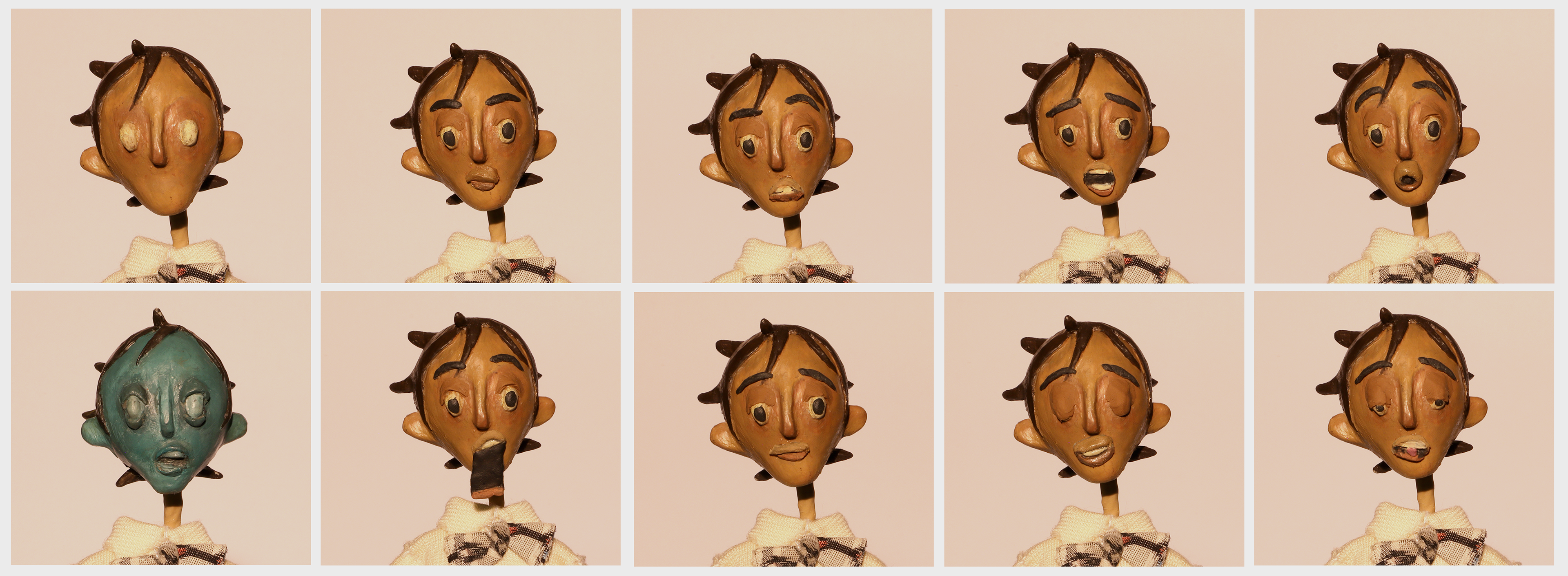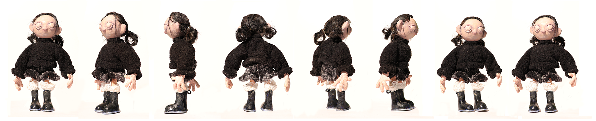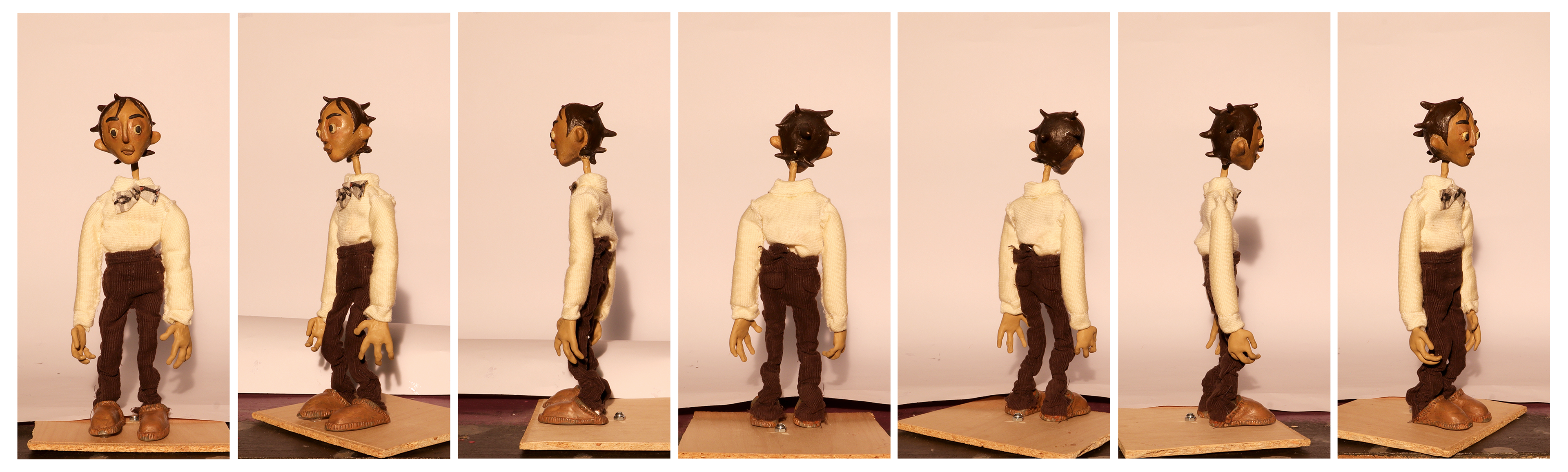 Costuming includes hand sewn shirt pattern with replaceable sleeves for arm swaps, bowtie with animateable collar and armature wire in the sleeve cuffs of the shirts to position and pose the fabric as needed (Pants were fabricated by Katelynn Iu).