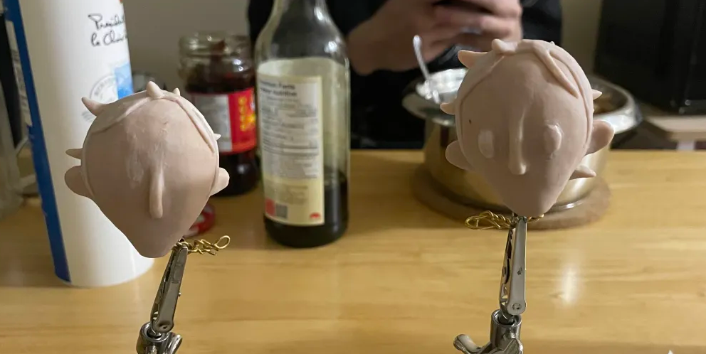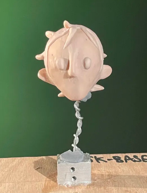 The Linguine Puppet features: hand cut aluminum blocks, with set screws, square and round brass stock, braided aluminum wire, aluminum foil, Apoxie Sculpt, Living Doll Super Sculpey, cotton, liquid latex, upholstery foam, super glue, and gouache.